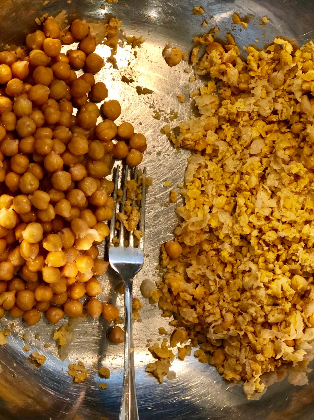 I try to keep the whole rinsed chickpeas separate in my bowl from the ones I’ve already smashed. In this photo I doubled the recipe. There is one can of chickpeas that have been smashed on the right side and my second can rinsed, drained and ready to be smashed is on the left side.