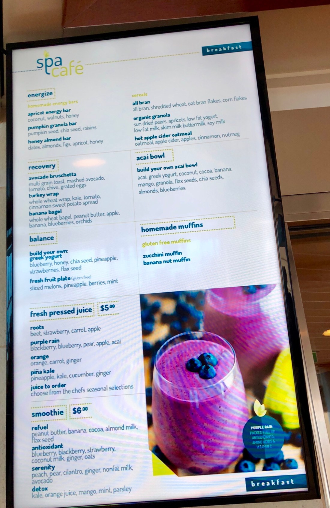 The spa cafe was my all time favorite. I can not even remember how many detox and antioxidant smoothies I ordered. (They are an extra cost if you don’t have the premium drink package) The homemade energy bars were sitting out daily during breakfast. I might have lost count of those too! The best part about the spa cafe is….it’s quiet! It was like my secret oasis that no one else had discovered.