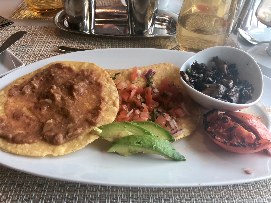 Each of the specialty restaurants we dined in went totally out of their way to make sure that our meals were dairy and meat free, they had no qualms with me picking and choosing from all over the menu to put something together. This is a photo of breakfast in Luminae, tortillas, sautéed mushrooms and roasted tomatoes.