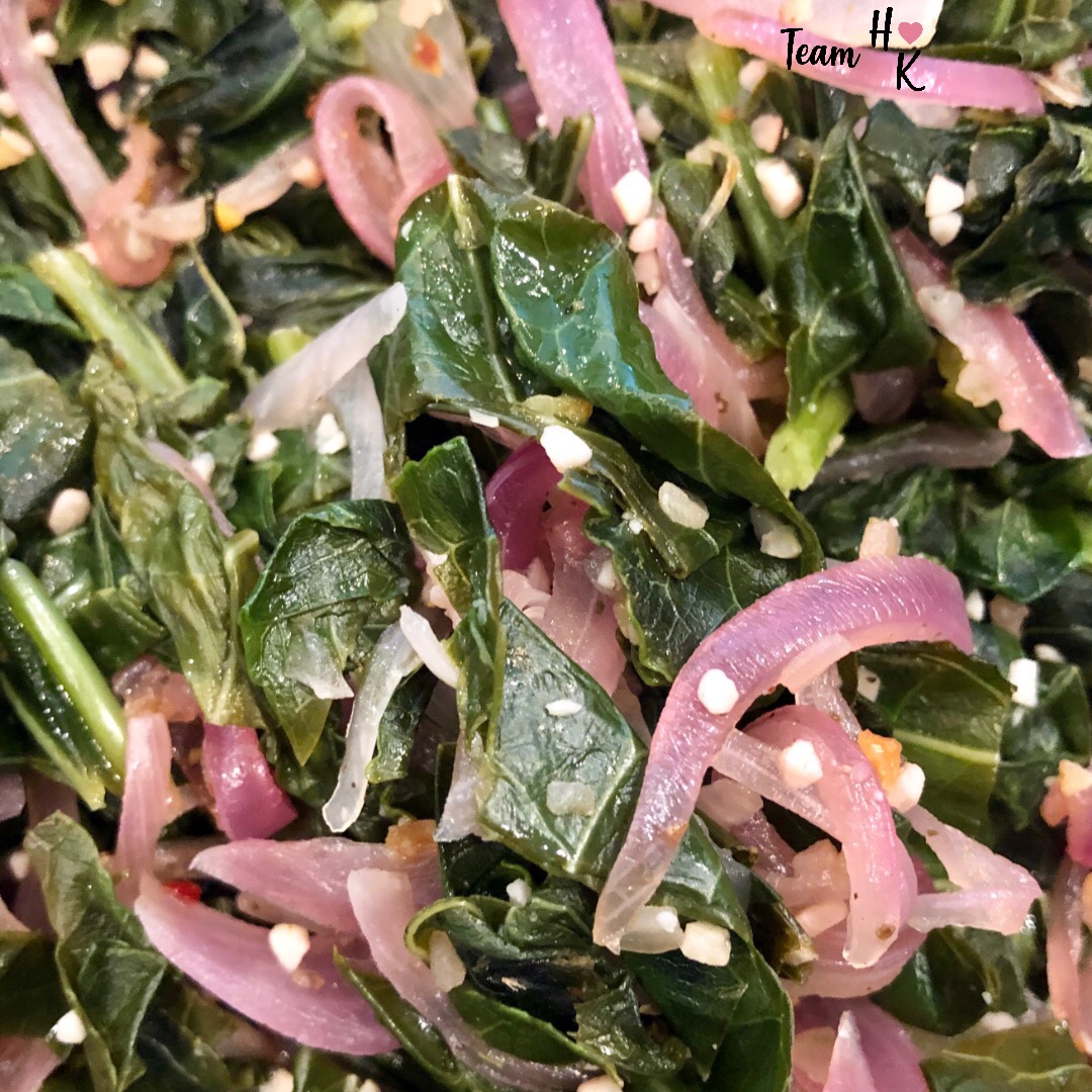 First cut the stems off and then blanch the leaves for 5 minutes. Remove from the water and roll each leaf on the diagonal and then slice in strips on the diagonal the other direction. Sauté the strips with a little garlic, red onion, and balsamic vinegar. Keep a little cup of water handy to prevent your veggies from sticking to the skillet. Enjoy this healthy little side. I used this as a side one night and as a section of a Buddha bowl the next.