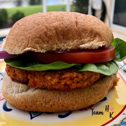 Hemp Burger on a 100% whole wheat bun, fresh baby spinach, tomato and red onion.