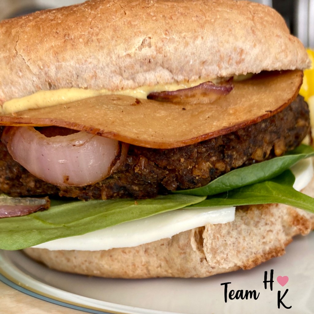 I toasted the buns for the burgers in my regular toaster. Usually, I like them toasted on the grill but alas winter has reared its snowy head again so no one wants to go outside and start up the grill. Quarantine for 5 weeks and snow…its time this strange vortex moved on. Our burger toppings were Tofurky smoked turkey slices, Daiya provolone style slices, baby spinach, sautéed red onions and dijon mustard