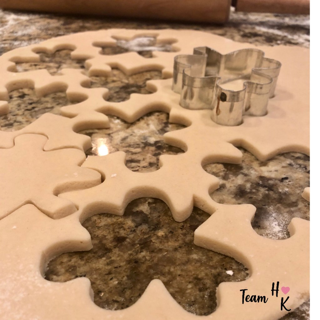 7. Roll out dough in sections, not the whole batch at once. Roll it out to 1/4″ thickness. Use cookie cutters to cut into shapes.
