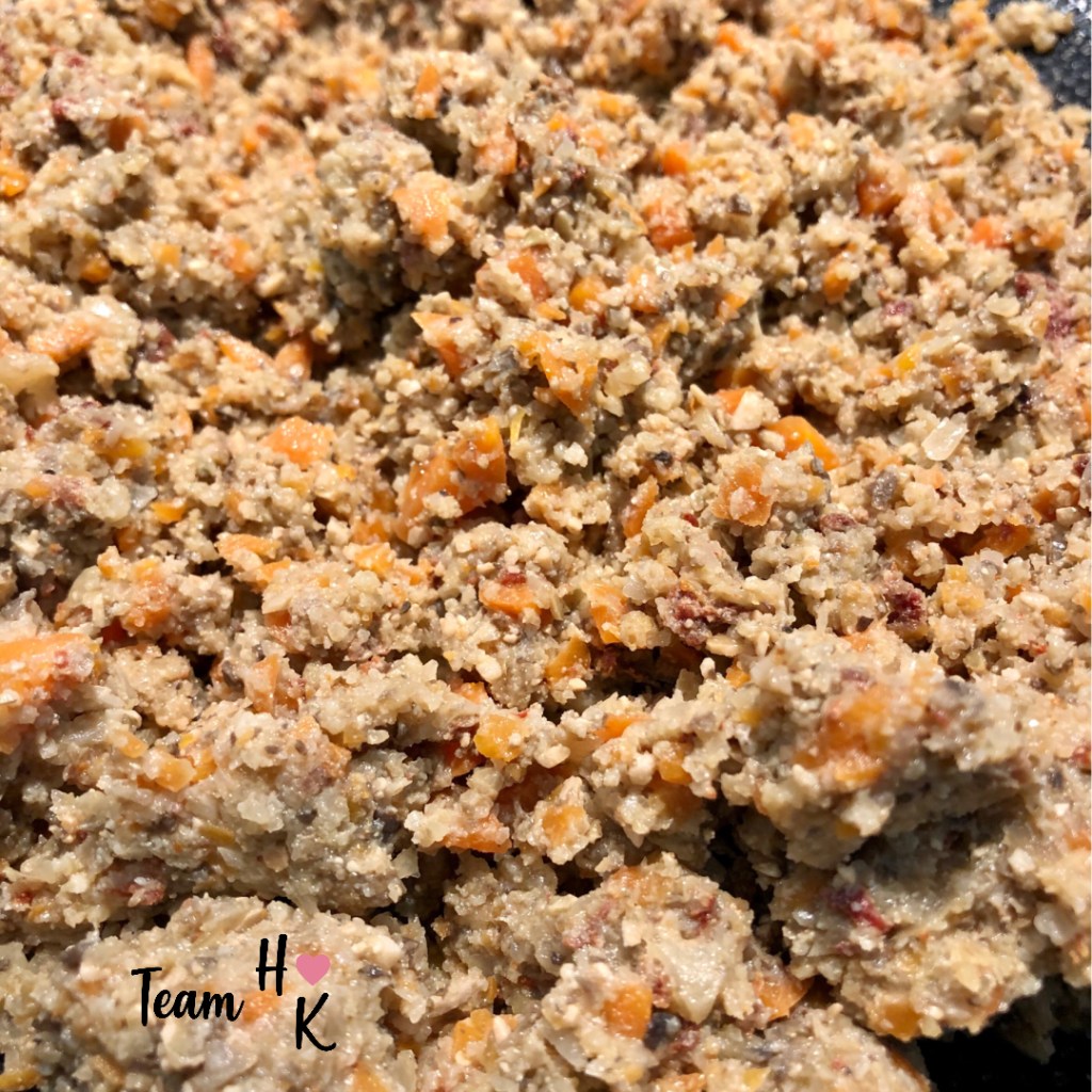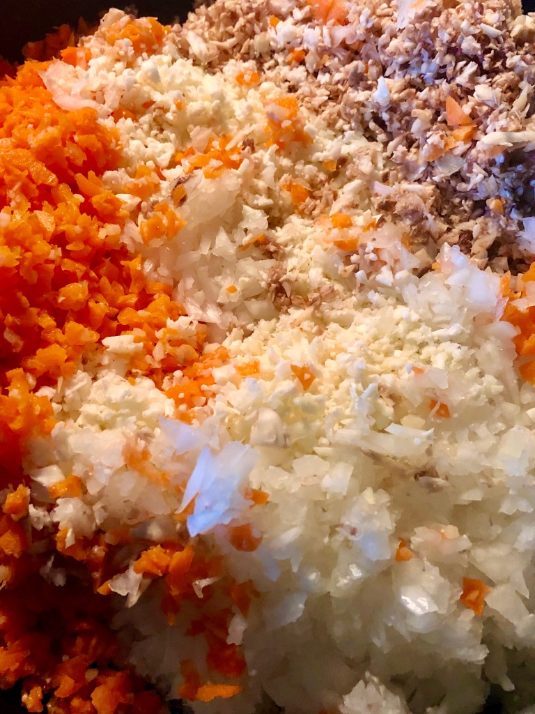 I put all the veggies through my food processor. Starting with the cauliflower florets, then the mushrooms in quarters, the carrots chopped into manageable pieces and finally the quartered onion. Next, cook the veggies along with 3 teaspoons of minced garlic, dried parsley and basil until the majority of the water cooks out. While these are cooking, I run the pepitas or walnuts and the sun dried tomatoes through my bullet, small food processor and add them to the veggies once the water has cooked out and cook for about 3 minutes longer.