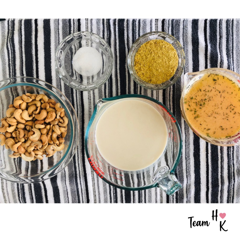 • 1 1/2 cups raw cashews, soaked in hot water for 5 minutes (Not necessary if using a Vita-Mix)