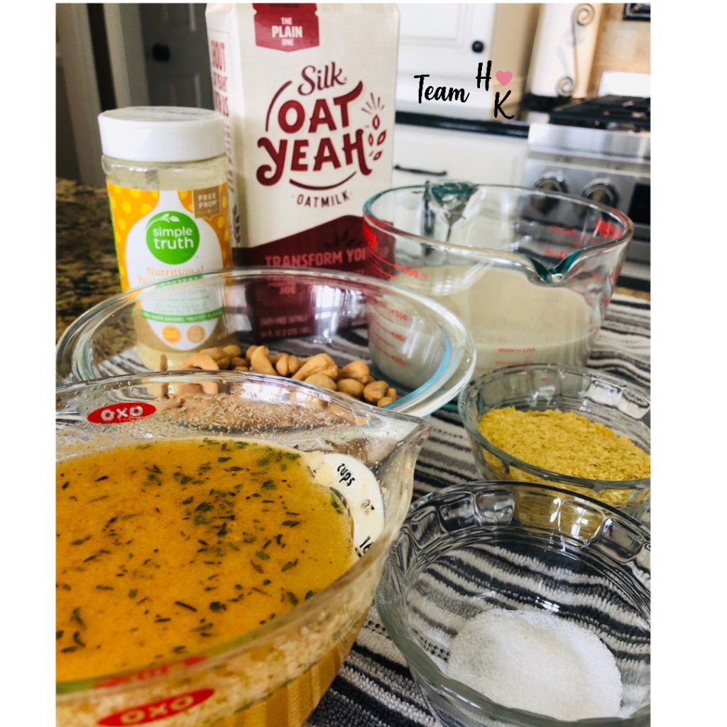 I have been using Oat milk lately and I like its texture and creaminess. If you aren’t familiar with nutritional yeast, its usually found in the baking products aisle in your grocery. The simple truth brand from Kroger is pictured here, next to the Silk oat milk.