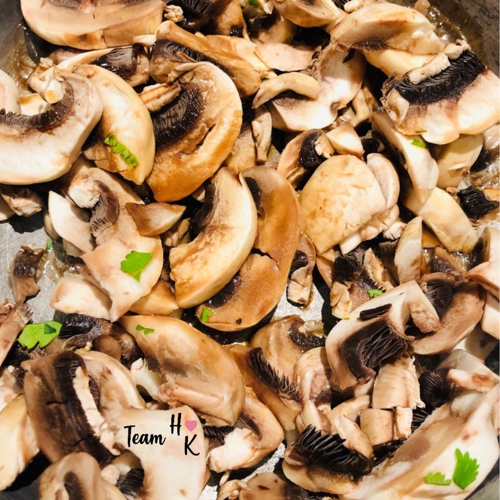 - Add sliced fresh mushrooms to pan, sauté slowly, do not add water, they should release enough liquid to sauté themselves.